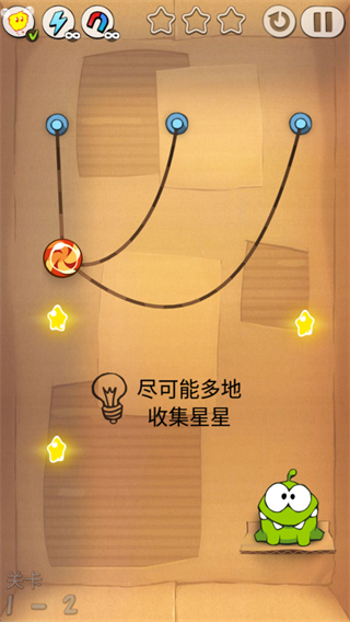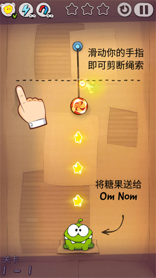 1、通過切斷繩子控制糖果運動軌跡,使其最終進入小怪物口中;